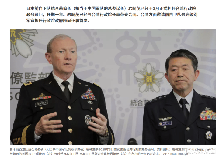 作为日本曾经最高级别的武官岩崎茂,退役后不甘寂寞去钓鱼也就罢了,偏偏要在2025年3月跑去担任台湾地区的“政务顾问”,公然勾连“台独”势力。