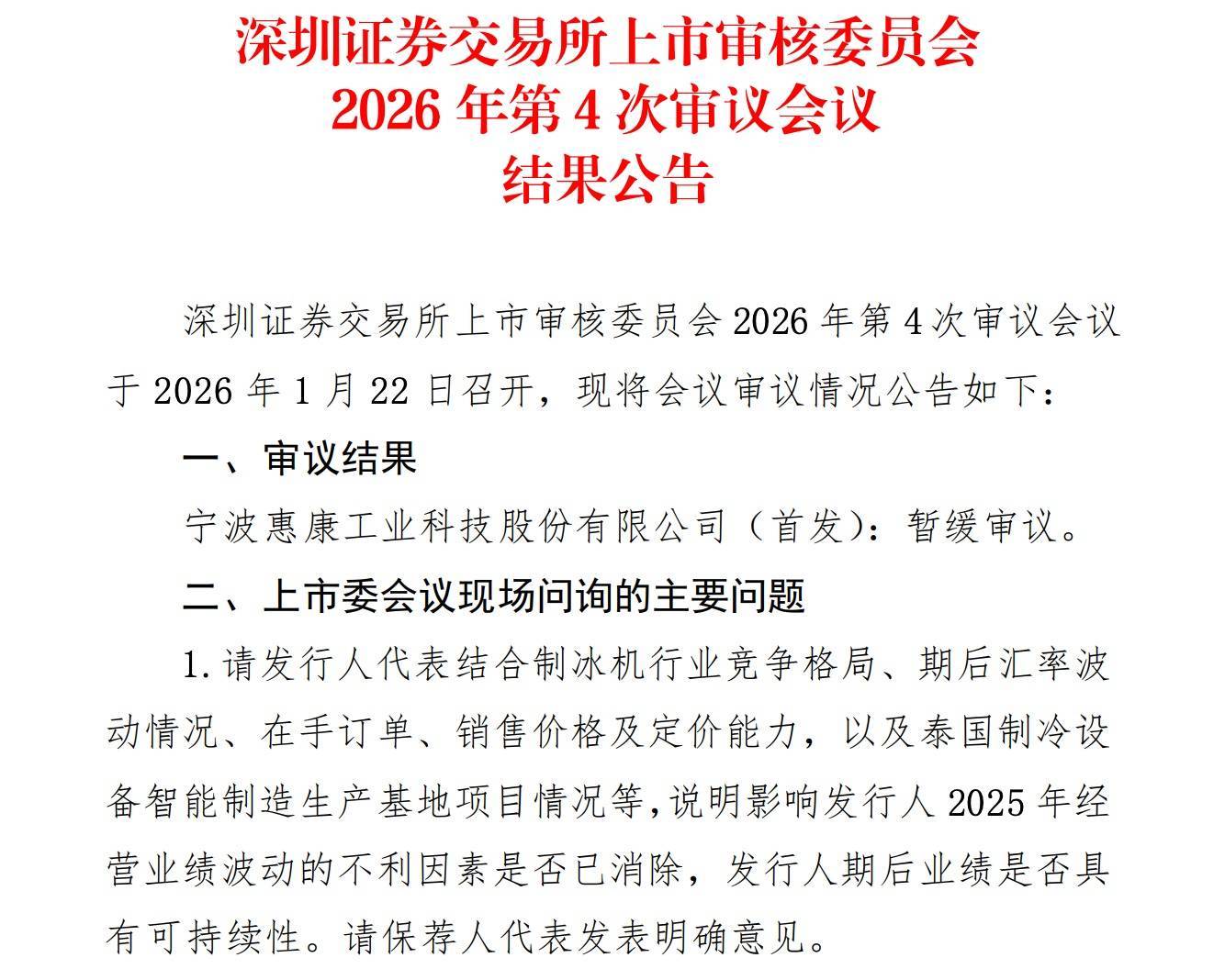 近日,深交所上市审核委员会的一纸 “暂缓审议” 公告,让宁波惠康工业科技股份有限公司(下称 “惠康科技”)成为年内深市主板首单IPO暂缓企业。
